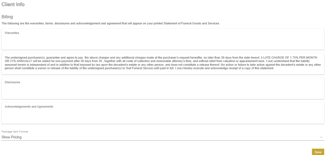 At the bottom of the information boxes, a setting is available as well to toggle if the pricing should display for package items on the Statement of Funeral Goods and Services or if it should be hidden and included on the document.