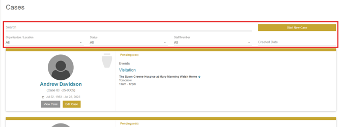 Cases in the system can be found on the cases page. At the top of the page there are a few different filtering and search options to find the case you are looking for. Names can be searched for directly in the search bar and filtering can be applied to search by location, status, staff member or creation date.