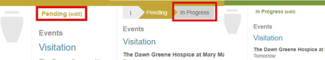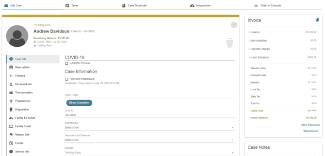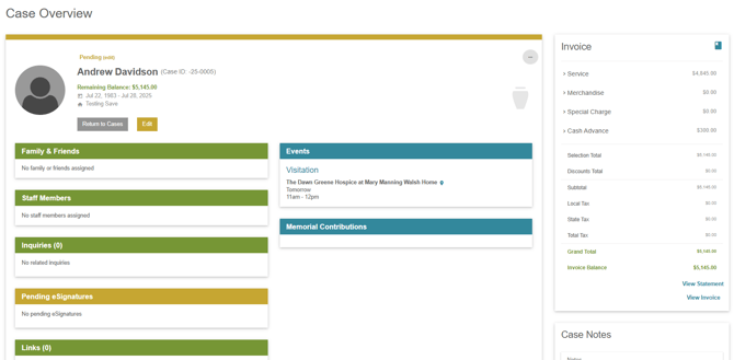 Cases that are listed will display some basic information such as name, case ID, date of birth, date of death and a photo. Upcoming events will also display along with the case's status above the events. To change a case's status, the status can be clicked and a new status can be selected for the case. If the status you are looking for does not initially appear, clicking the 3 dots will show any additional statuses available.