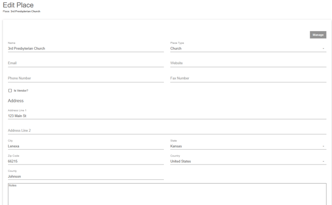 When adding a new place or editing an existing place, a variety of information can be entered for name, type, contact information venue information and address information.