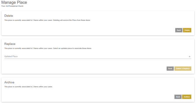 At the top of the edit page, a manage button is available that gives options to delete, replace or archive a place. When replacing a place, all the cases that have the place attached for events or case information will be have that location replaced with the new place.