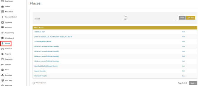 The places page contains all the places that are entered in the system. New places such as churches, venues, cemeteries, home addresses and more can be added to the system and information for existing places can be edited.