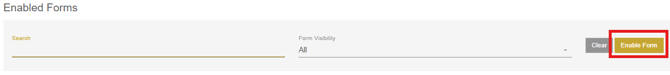 In the forms page of the admin settings, forms can be enabled for different locations in the system. To enable a form in the system, type the form name to find the form and click the enable form button to enable the form in the system.