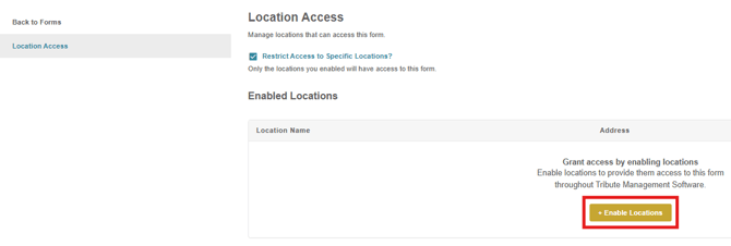 After clicking the manage location access option, the form access page will appear. By default, a form will be accessible to all locations in the system. If the restrict access to specific locations setting is toggled, the enabled locations area will appear. Locations can be added to have access to this document via the enable locations button at the bottom of the section.