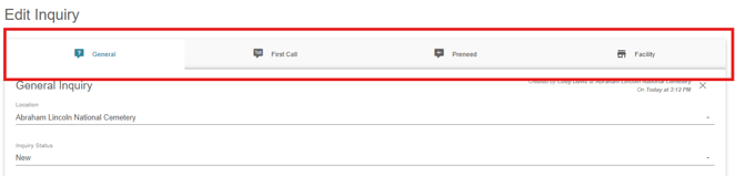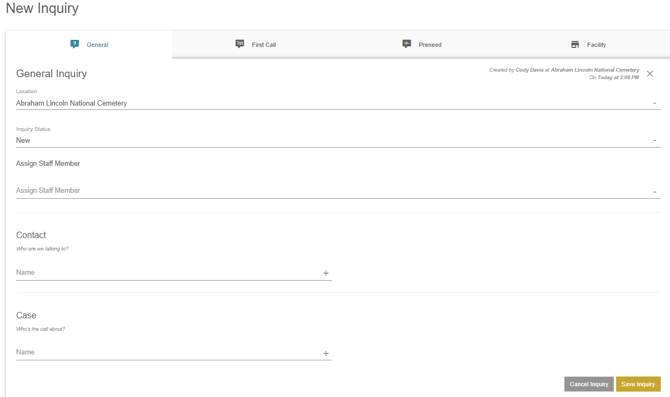 Along the top row, there are 4 different types of inquiries that can be added. General, first call and preneed inquiries all allow for the same information to be entered. Facility inquiries will not show a case area to connect a case and instead will show an events section for any upcoming events using that facility.