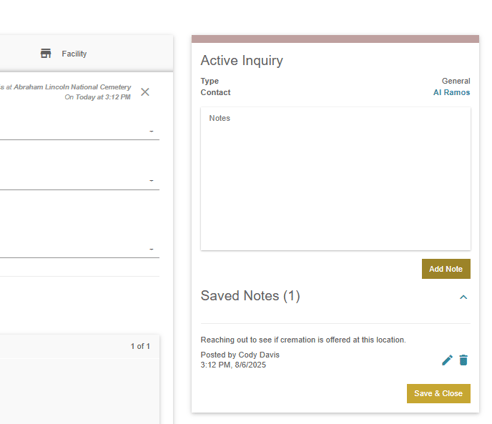 On the right side, notes can be added regarding the inquiry. Any previously added notes will show in the saved notes portion of the notes area.