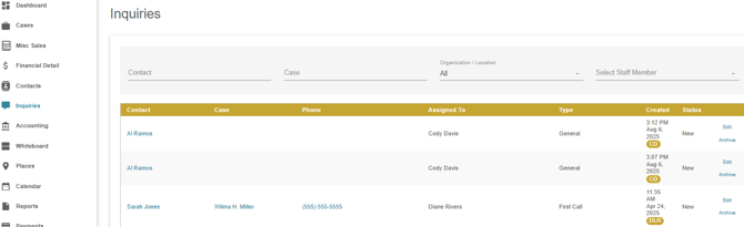The inquiries page allows you to view all inquiries in the system. Inquiries in the list can be filtered by contact, case, location and staff member. Basic information will be displayed for the inquiry showing the contact name, status, type of inquiry and date of creation. Inquiries can be opened for editing by clicking the edit link on the right side and inquiries can also be archived by clicking the archive link on the right side.