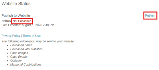 The Tribute Website section will show the status of the case on the website and give you access to a variety of settings and options for setting up the Tribute Page on the website.