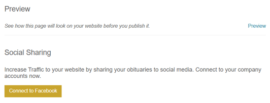 Below the status, options are available to preview the Tribute Page and post the obituary to Facebook.