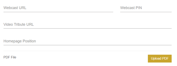 Webcast/Livestream links and video links can be added in the corresponding areas. A homepage position can also manually be set by adding a number in the homepage position area. This will set the obit to display in the specific position on the homepage obituary slider of the website. An option is also available to upload a PDF file that will be posted to the Tribute Wall for visitors to download.