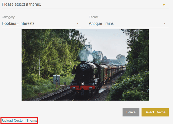 Under the header theme area, a theme image for the Tribute Page banner can be selected. An option is also available to upload a custom image as the theme via the upload custom theme link.