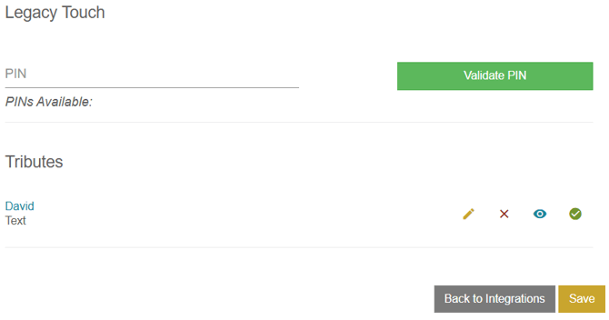 Towards the bottom of the Tribute Website section, a Legacy Touch pin can be added to the page and condolence messages can be viewed and edited in the tributes area.