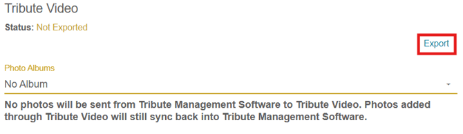 The Tribute Video integration allows you to send photos and basic information to Tribute Video. Before you can export to Tribute Video, you will need to select a photo album from the drop down list. If there is no photo album on the case, the option No Album can be selected. Click export after to be taken to the Tribute Video portal.