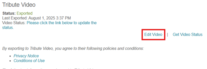 Once the case has been exported to Tribute Video, you will see the status changed to exported and options will be available to edit the video or get the video status. Anytime you need to navigate back to Tribute Video to continue working on the video, the Edit Video button will take you to the video editor.