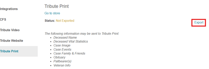 The Tribute Print integration allows you to export case information to Tribute Print for printing stationary items. Simply click the export link to export the case to Tribute Print.