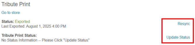 Once a case is exported to Tribute Print, options will be available to Resync the case and update the Tribute Print status for the case.