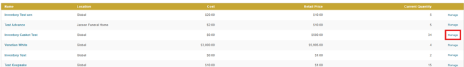 The inventory page gives you insights into the various inventoried items you have in the system. Items can be marked as inventory in the General Price List which will allow them to be tracked in the inventory page. On the initial inventory page, a list of inventory items will be shown with the ability to filter by location or search for a particular item at the top. Information like name, location cost, retail price and quantity will all be shown in the list. To view details on a specific item or adjust quantity, simply click the mange button on that item.