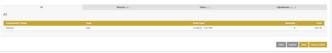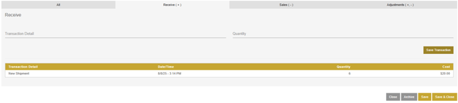 On the receive tab, new inventory can be added for this item. If a new delivery comes in for example, an entry can be made here by adding the transaction detail and quantity, then clicking save transaction. Once saved, the transaction will show in the list and the inventory quantity will be updated for this item.