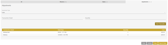 The adjustments tab allows you to make adjustments to the inventory numbers. If you were missing an item for example, an adjustment can be added here to remove 1 item from your inventory quantity. Under adjustment type, less or more can be selected for adding or removing quantity. Any adjustments made will alter the total quantity and display in the transaction list.