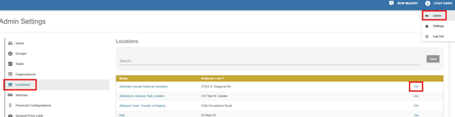 Under the locations tab in admin settings, various information and settings can be changed for locations in the system. Once on the locations page, you will see a list of locations that are in the system. To edit a location, simply click the edit link on the right side of the location in the list.