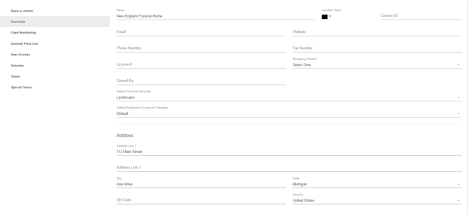On the overview tab of a location, various information related to the name, contact, address and other basic information can be edited here. Defaults can also be set for the contract template and statement of account template.
