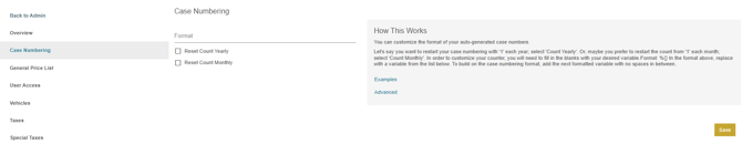 The case numbering tab allows for you to set a case ID numbering structure for the location. There is an explanation on the right side that explains how the case number works. Options are also available for resetting the case number count yearly or monthly.