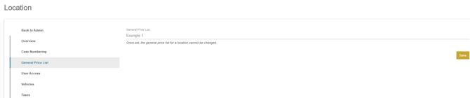 The general price list tab allows you to set a price list for the location. It is important to note that once a price list is set for a location it cannot be changed.