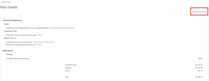 When viewing plan details, you will be taken to the plan details page. On this page, all the information and selections entered by the user will be displayed. An export of the plan to a PDF file is available via the export plan to pdf link in the top right corner.