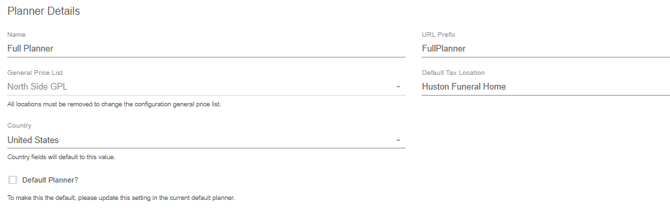 Once on the edit page for a planner, you will first land on the overview tab. In the first area of the overview tab, certain planner details can be configured such as name, URL prefix, tax location and country. The general price list cannot be changed unless the locations are removed from the locations section further down on this page.
