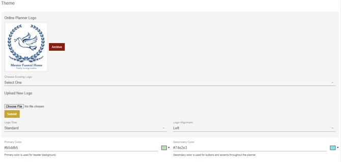The theme portion of the overview tab allows you to set certain design styles for the planner such as primary color, secondary color, fonts and also allows you to upload a company logo.