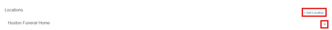 Under the locations section, serving locations associated with the planner can be added or removed. Locations can be added via the add location link and a location can be removed by clicking the red x.
