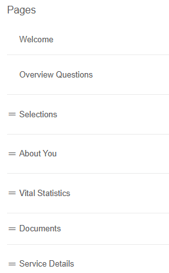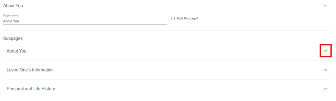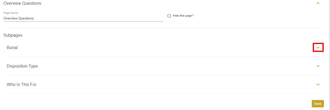 On the over questions page, the Burial, Disposition Type and Who Is This For subpages can be customized. Click the arrow beside each subpage to view the configurations for each section.