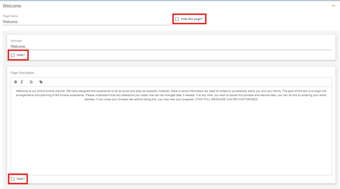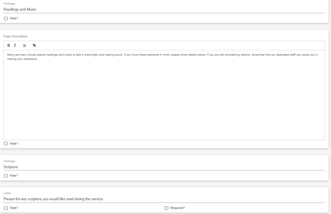 On the funeral services page, information is collected regarding funeral service choices. Similar to the other information subpages, the various labels can be edited, hidden or marked.
