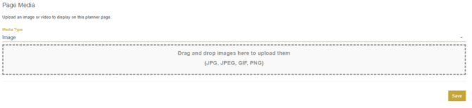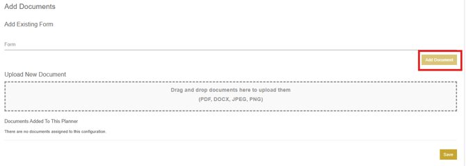 In the documents section, documents can be uploaded for the user to download from the planner. There is also an option on the users side to upload documents to be attached to the plan once submitted. Like all the other sections, the page name and description can be customized. Below the description, documents can be searched for in the system to add to the planner, simply search a document name and click add document to add the document to the planner. Documents can also be uploaded via the drag and drop box.