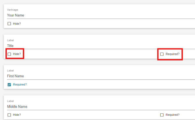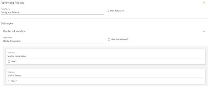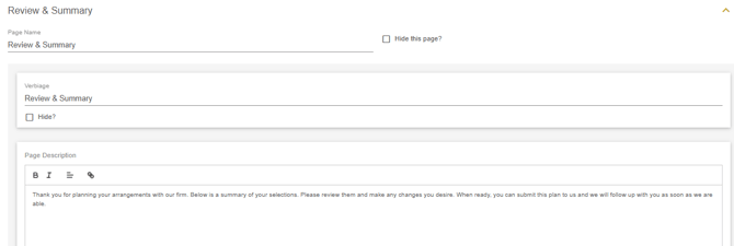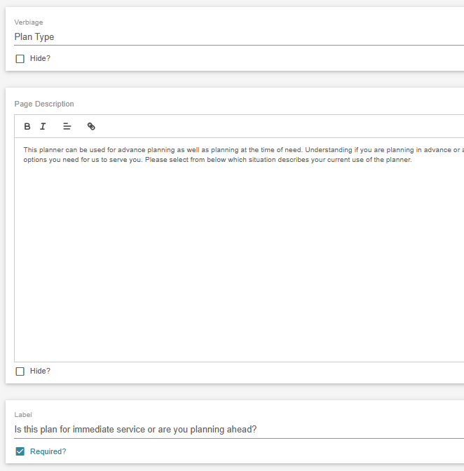 Each subpage has a variety of default information points that will appear in the planner. Each input can be hidden if needed via the hide checkbox or made required via the required checkbox. Some labels cannot be hidden because they are required on every plan.