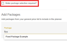Under the page description, the add packages area will allow you to add or edit packages that are showing on the section. Package selection can be made required via the make package selection required checkbox at the top and packages can be search for to add to the planner via the package search bar. Only packages listed in the general price list assigned to the planner will be selectable.