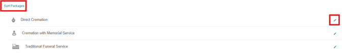 Any packages currently on the planner will be listed out. Packages can be ordered via the sort packages link in the top left and packages can be edited via the pencil icon on the right side.