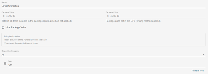 On the edit window for a package, price cannot be adjusted. The package price is set in the GPL and would need to be edited in the GPL if changes are needed. Name is customizable and an option is available to hide the package value on the planner. The disposition category option at the bottom will give the option to restrict this package to a specific disposition selection if needed. For example, if the disposition category is set to burial, the package will only display in the planner when a user selects burial as the disposition.