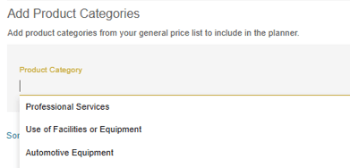 The products section works very similarly to the packages section. In this section, products can be added to the planner for the user to select from. First, a product category must be added. Product categories can be searched for and selected via the search bar.