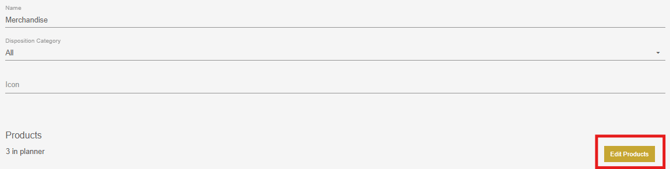Once a product category is added, click the pencil icon on the right side of the category to open the edit window. On this window, product category name can be edited and a disposition category or icon can be added. To add products to this category, click the edit products button.
