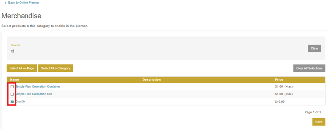 After clicking edit products, you will be taken to the product page for that category where you can select items you want to add to this category. Items can be searched for via the search bar at the top of the section. To add a product, simply click the checkbox on the left side of the product and click save once you have made all of your selections. If you need to remove items, simply uncheck the box and save.