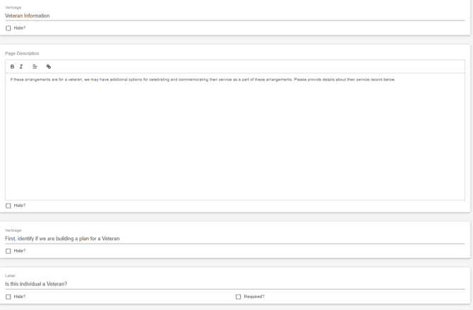 The veteran information section is also another page on the planner collecting various information related to veterans. Default information can be hidden or marked as required and custom fields can be added if additional information needs to be collected.