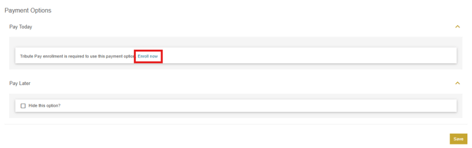 On the payment collection section, payment options can be added to the planner. Plans can be submitted with payment enabled or with the option to pay later. If you want all plans to be paid for upon submission, make sure to check the hide this option checkbox on the pay later area. Payments for the Online Planner are processed through Tribute Pay, and in order to enable payments you will need to be enrolled in Tribute Pay. An option is available on this section to enroll in Tribute Pay if you are not enrolled.