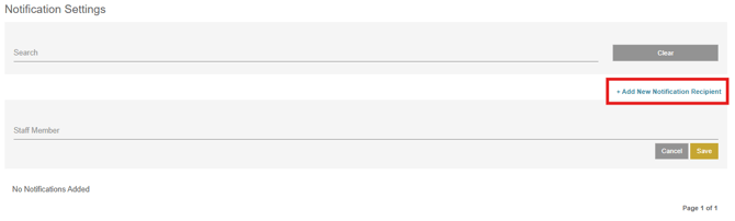 The notification settings allow you to set up a staff member to receive notifications when a plan is submitted. To add a staff member, simply click the add new notification request link in the right corner. A window will appear where staff members can be searched for, click the staff member to add them to the notification list and click the save button. That staff member will now receive notifications every time a plan is submitted from the Online Planner.