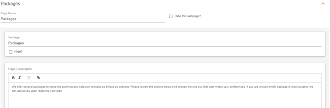 The selections tab lets you customize what packages and products will display for the user to select from in the planner. Both a package and product area is available to customize on the selections page. The name, verbiage and description for the section are available to be customized along with an option to hide the subpage if needed.