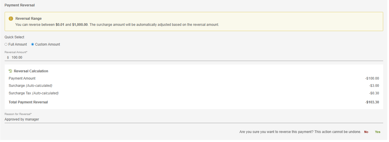 If surcharging is enabled, the surcharged amount and any applicable surcharge taxes will be automatically calculated in proportion to the reversal amount. When entering a custom amount, be sure to enter a number reflecting the original (base) reversal amount.