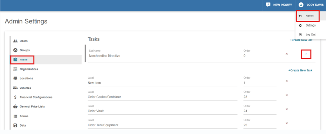 Tasks can be entered into the system via the admin settings area of the system. To add tasks or list names to the system, click your name in the upper right corner of the screen and select the admin option. This will take you to the admin settings where you can select tasks. Under the tasks area, lists can be created and tasks can be added or edited. Click the drop down arrow beside a list to expand and show the various tasks that are under that list.