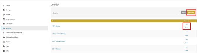 In the vehicles tab of the admin settings, you can view the vehicles that are currently in the system and easily add or edit vehicles. To edit a vehicle, simply click the name of the vehicle or the edit button on the right side. Vehicles can also be deleted from the system by clicking the remove button. To add a new vehicle, click the add new button by the search bar.