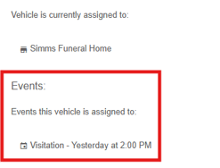 If the vehicle has been used on any recent events, a list of those events will be displayed at the bottom of the section.