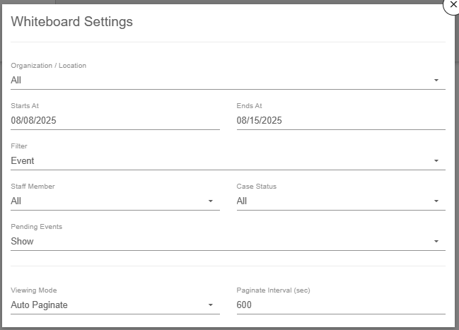 Under settings, various filter options are available for controlling what cases will show on the whiteboard. Options are available to filter by location, start/end times, case status and staff member. Settings are available as well to toggle if pending events should show or not and pagination options are available to toggle how long the whiteboard will wait to rotate through pages.
